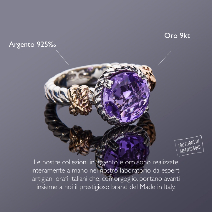 Anello realizzato a mano, esclusivamente nel laboratorio de' Nobili, in argento 925 e in oro rosa 9kt e semipreziosi briole'.
