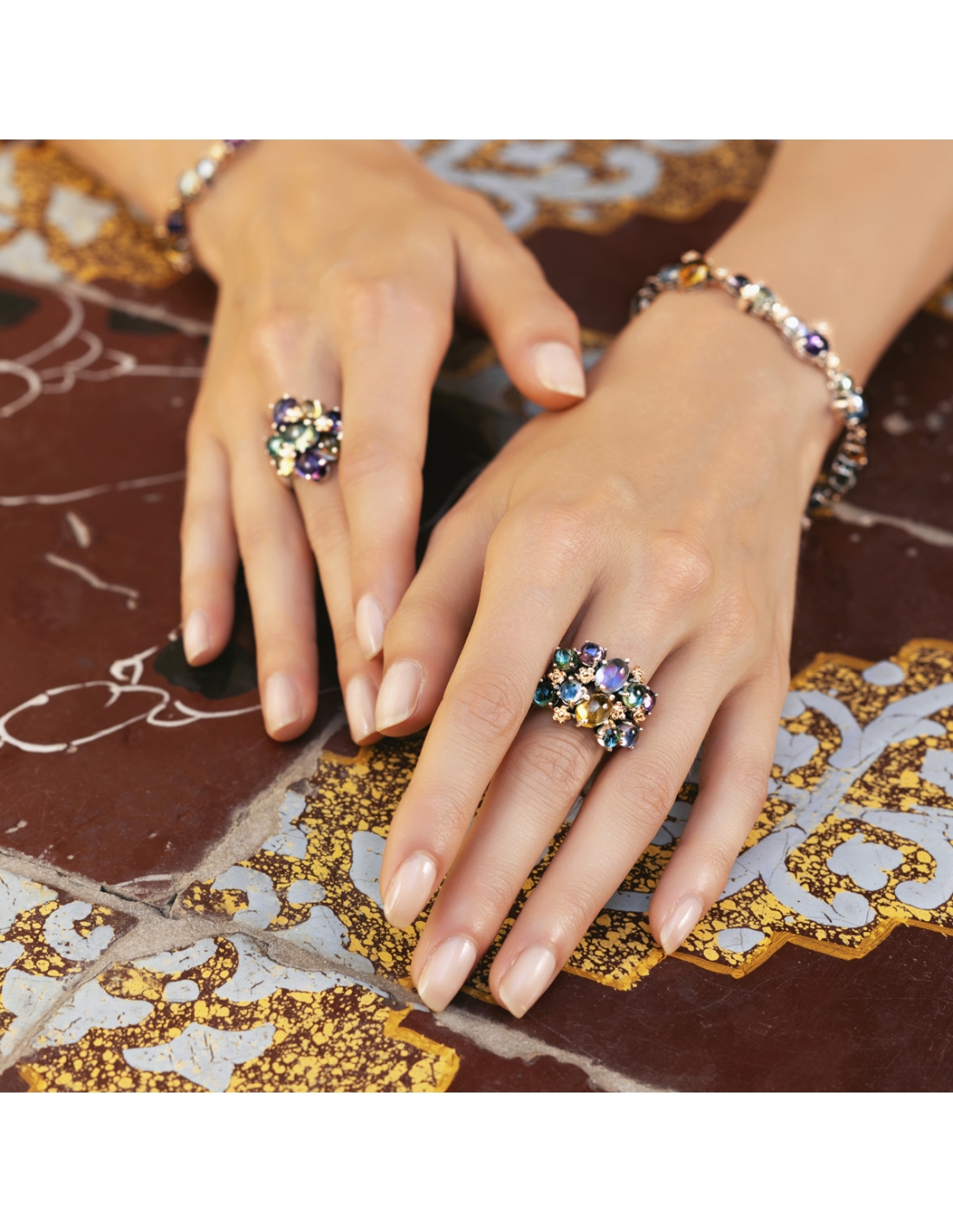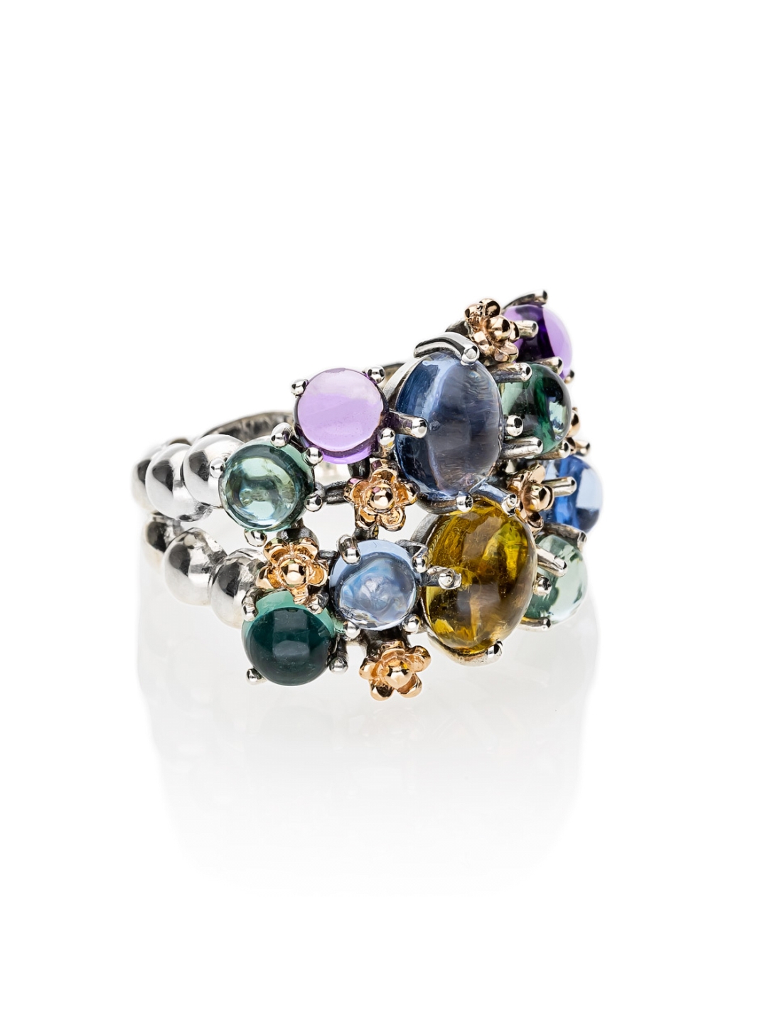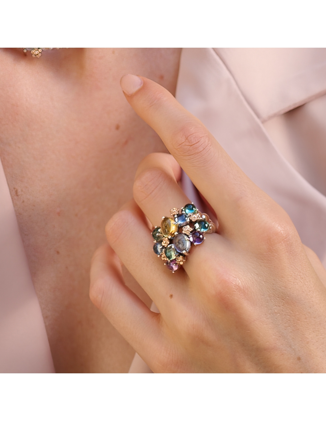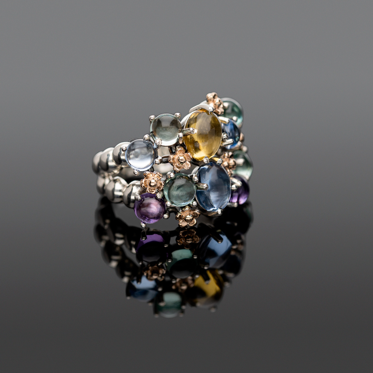 Anello realizzato a mano, esclusivamente nel laboratorio de' Nobili, in argento 925 e oro rosa 9kt con cabochon di quarzi idrotermali.
