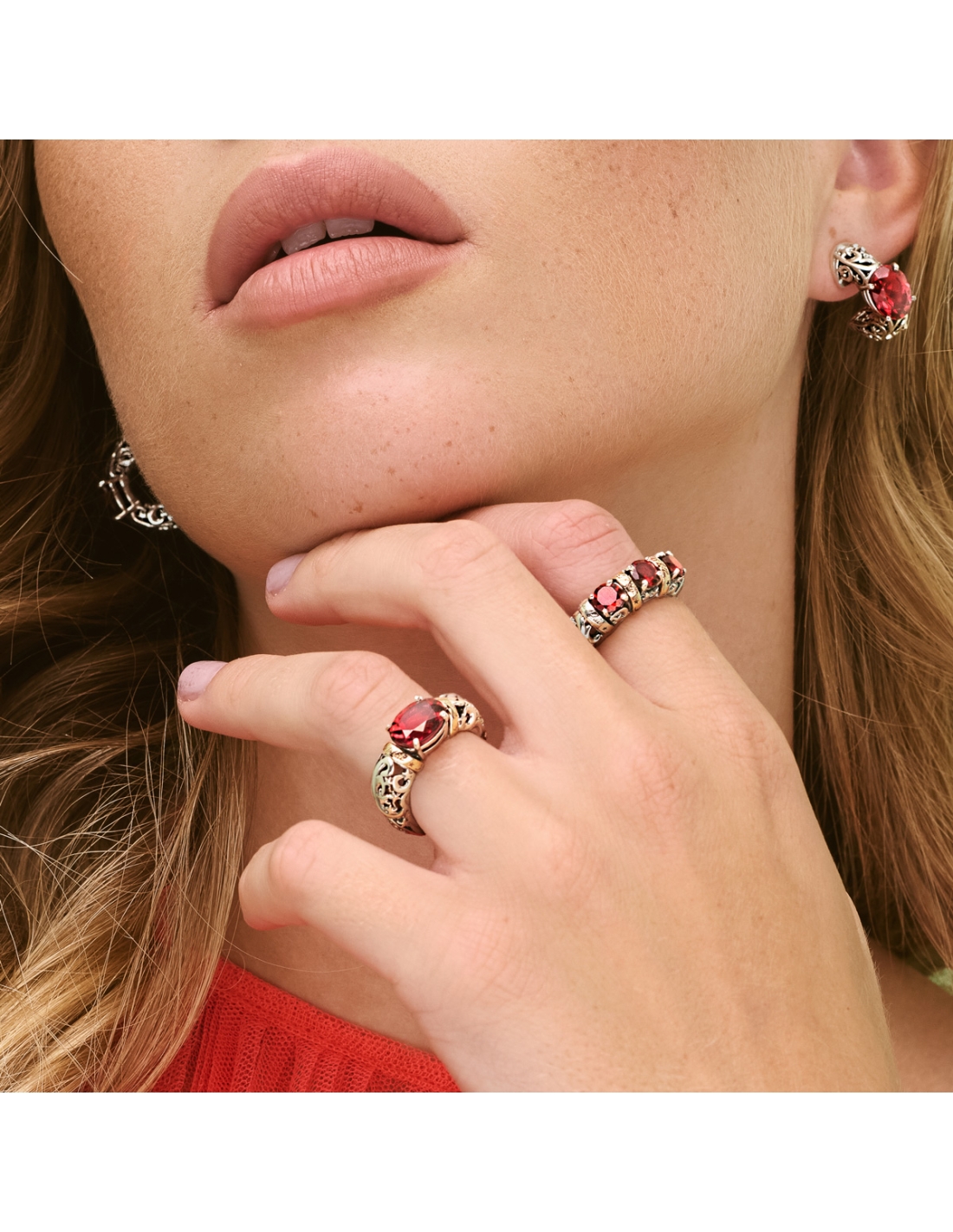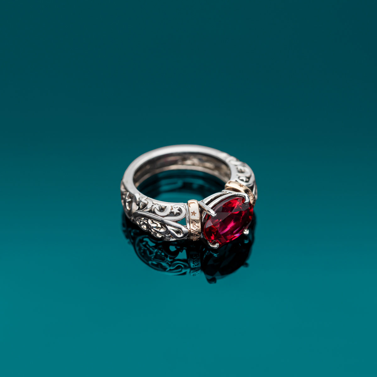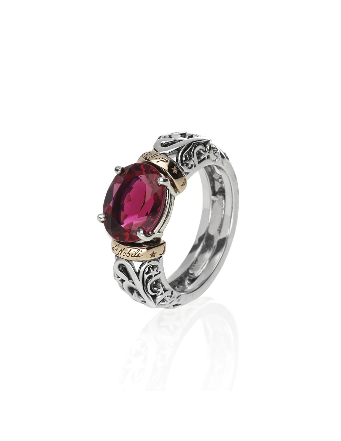 Anello realizzato a mano, esclusivamente nel laboratorio de' Nobili, in argento 925 e oro rosa 9kt con quarzo idrotermale taglio ovale: verde, azzurro, viola e giallo.