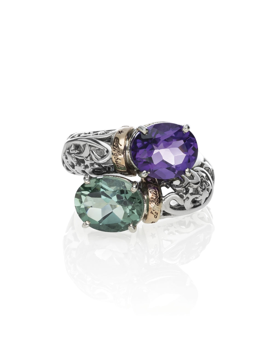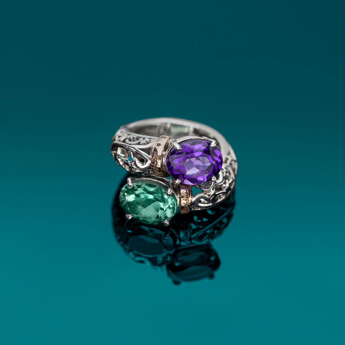 Anello realizzato a mano, esclusivamente nel laboratorio de' Nobili, in argento 925 e oro rosa 9kt con quarzi idrotermali taglio ovale.