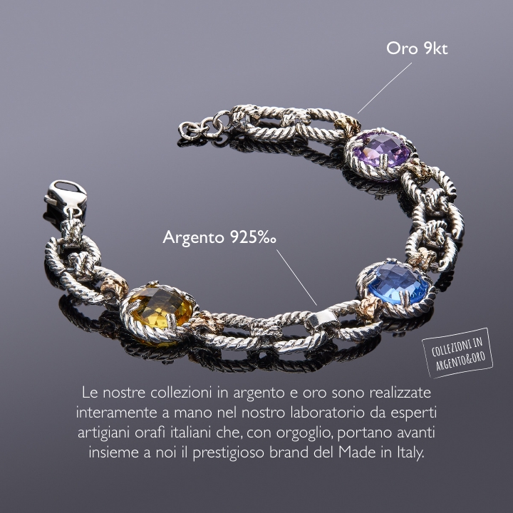Bracciale realizzato a mano, esclusivamente nel laboratorio de' Nobili, in argento 925 e in oro rosa 9kt con semipreziosi briole'.