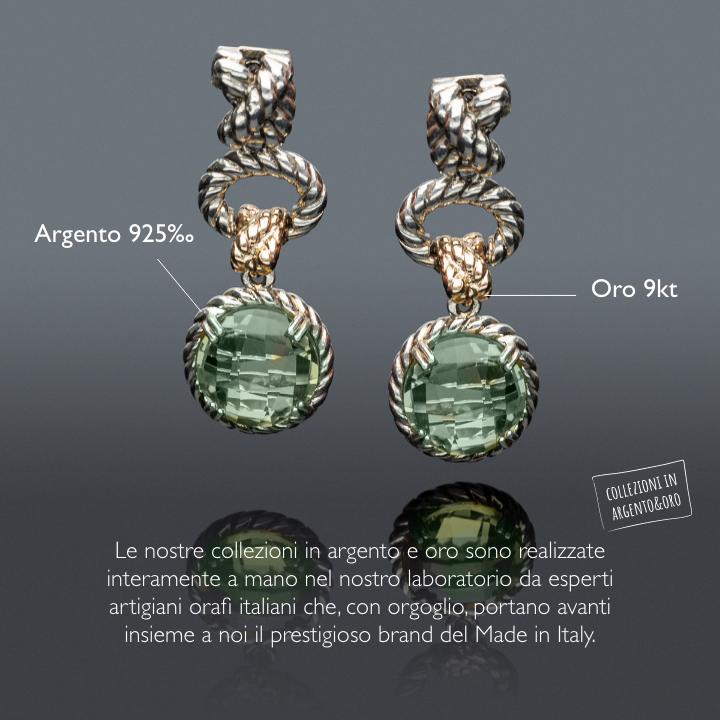 Orecchini realizzati a mano, esclusivamente nel laboratorio de' Nobili, in argento 925 e in oro rosa 9kt con semipreziosi briole'.