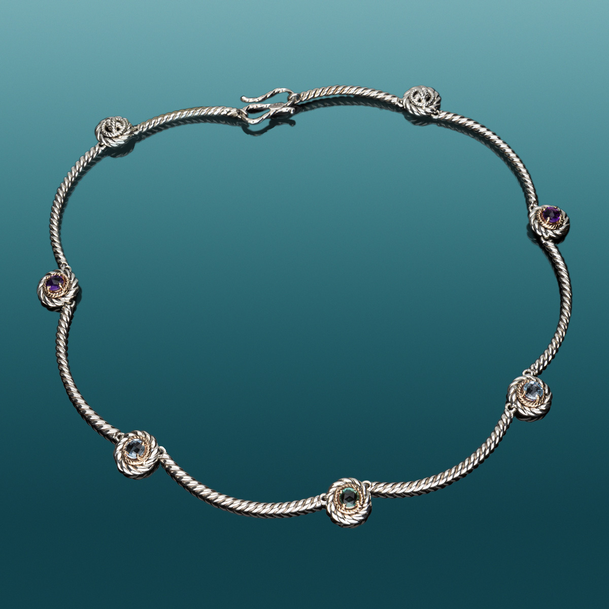 Collana realizzata a mano, esclusivamente nel laboratorio de' Nobili, in argento 925 e in oro rosa 9kt con quarzi idrotermali vari colori.