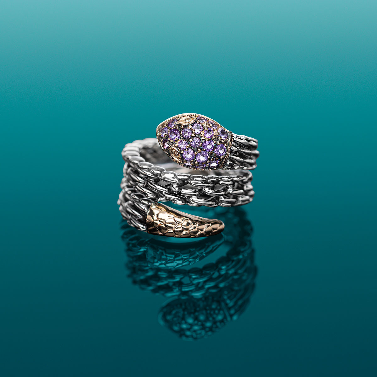 Anello in oro rosa 9kt e argento, con diamanti brown e semipreziosi: ametista, quarzo citrino, topazio azzurro, fumè, peridoto.