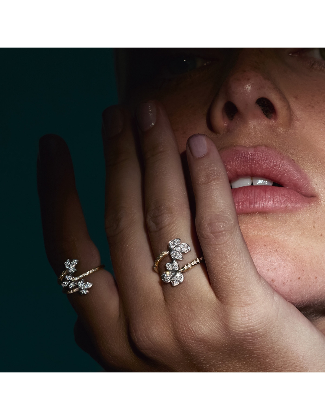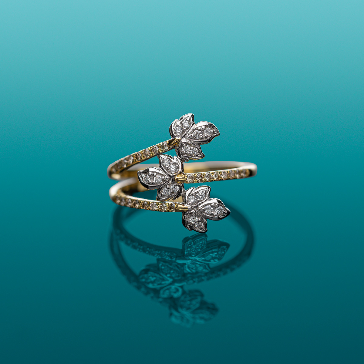 Anello realizzato a mano, esclusivamente nel laboratorio de' Nobili, in oro bianco e giallo 18kt con diamanti taglio brillante di qualità F-VVS.