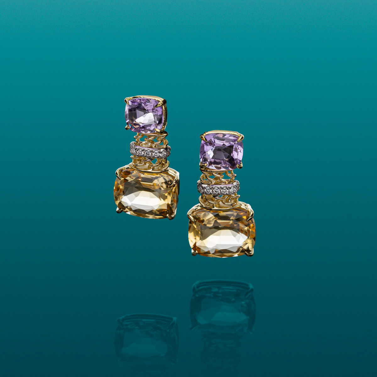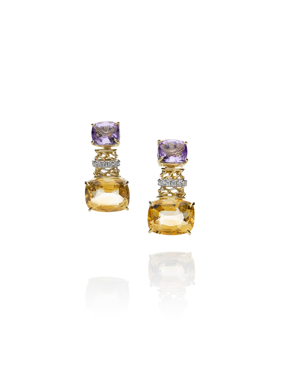 Orecchini realizzati a mano, esclusivamente nel laboratorio de' Nobili, in oro bianco e giallo 18kt con brillantini, con quarzi citrini e ametista taglio cuscino.