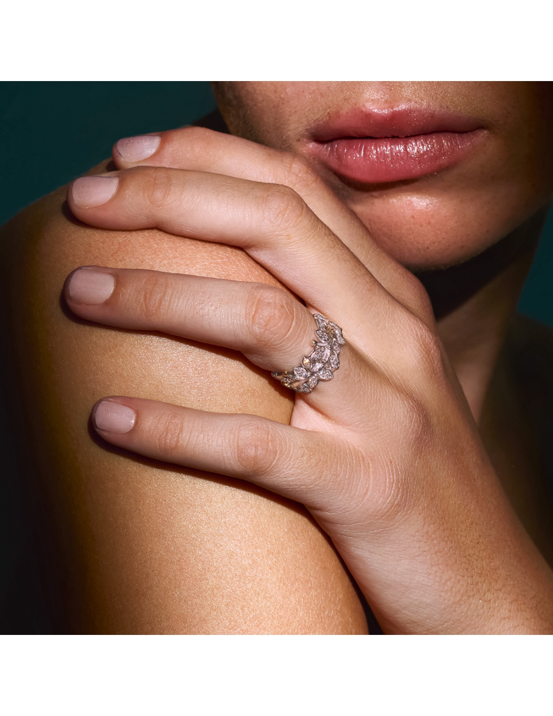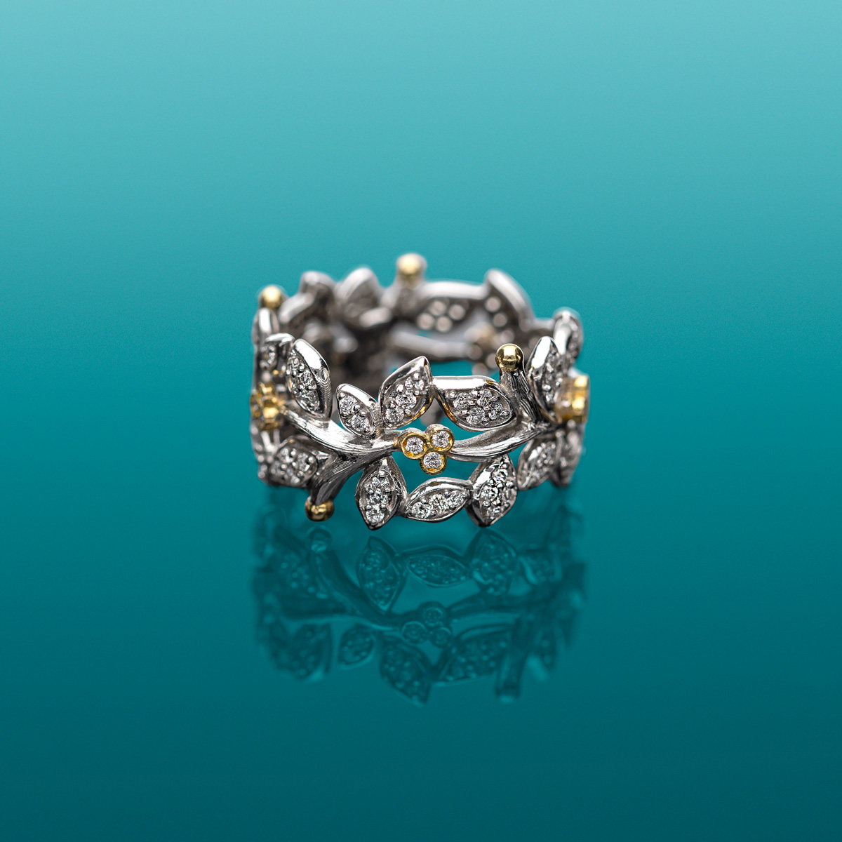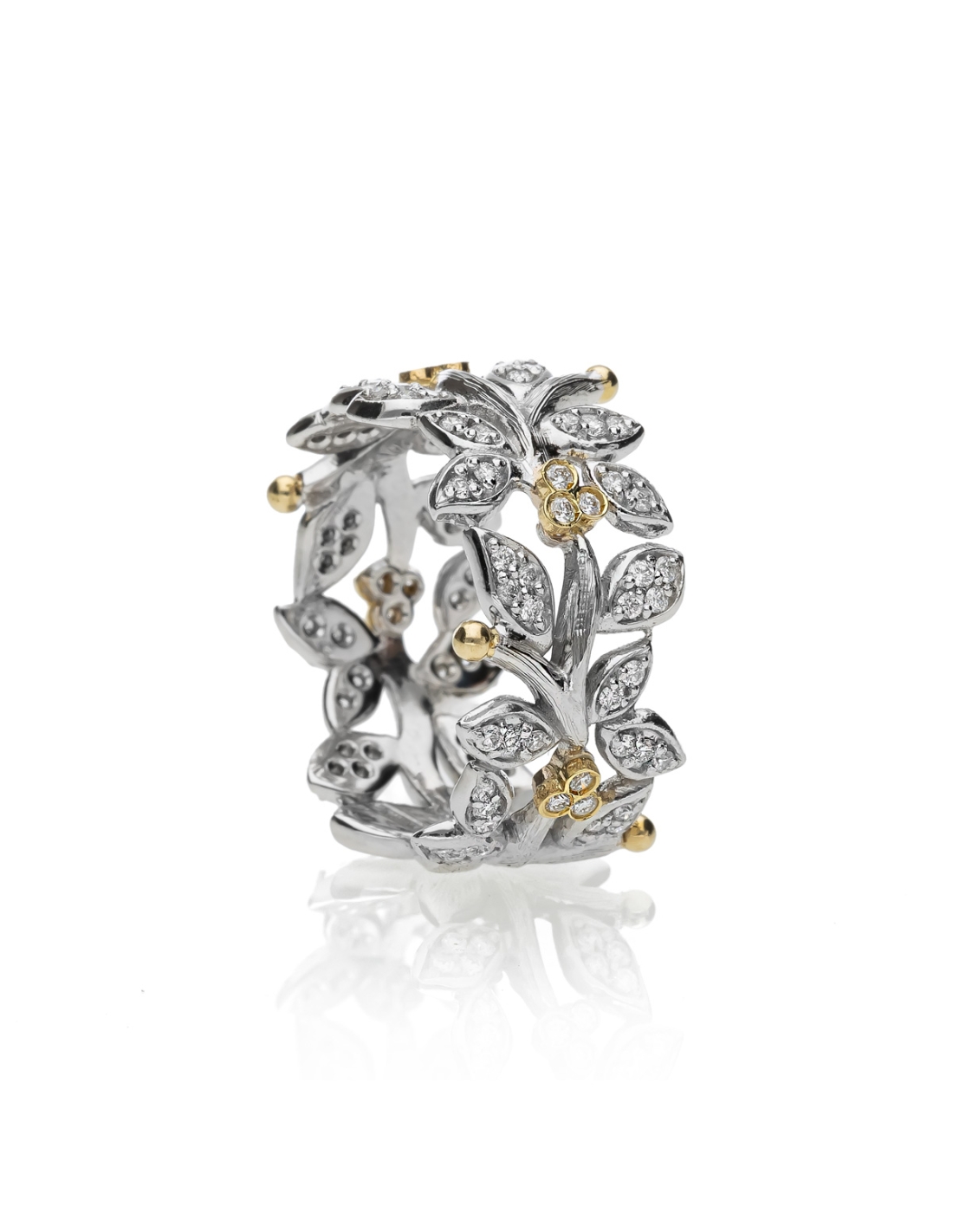 Anello realizzato a mano, esclusivamente nel laboratorio de' Nobili, in oro bianco e giallo 18kt con diamanti taglio brillante di qualità F-VVS .