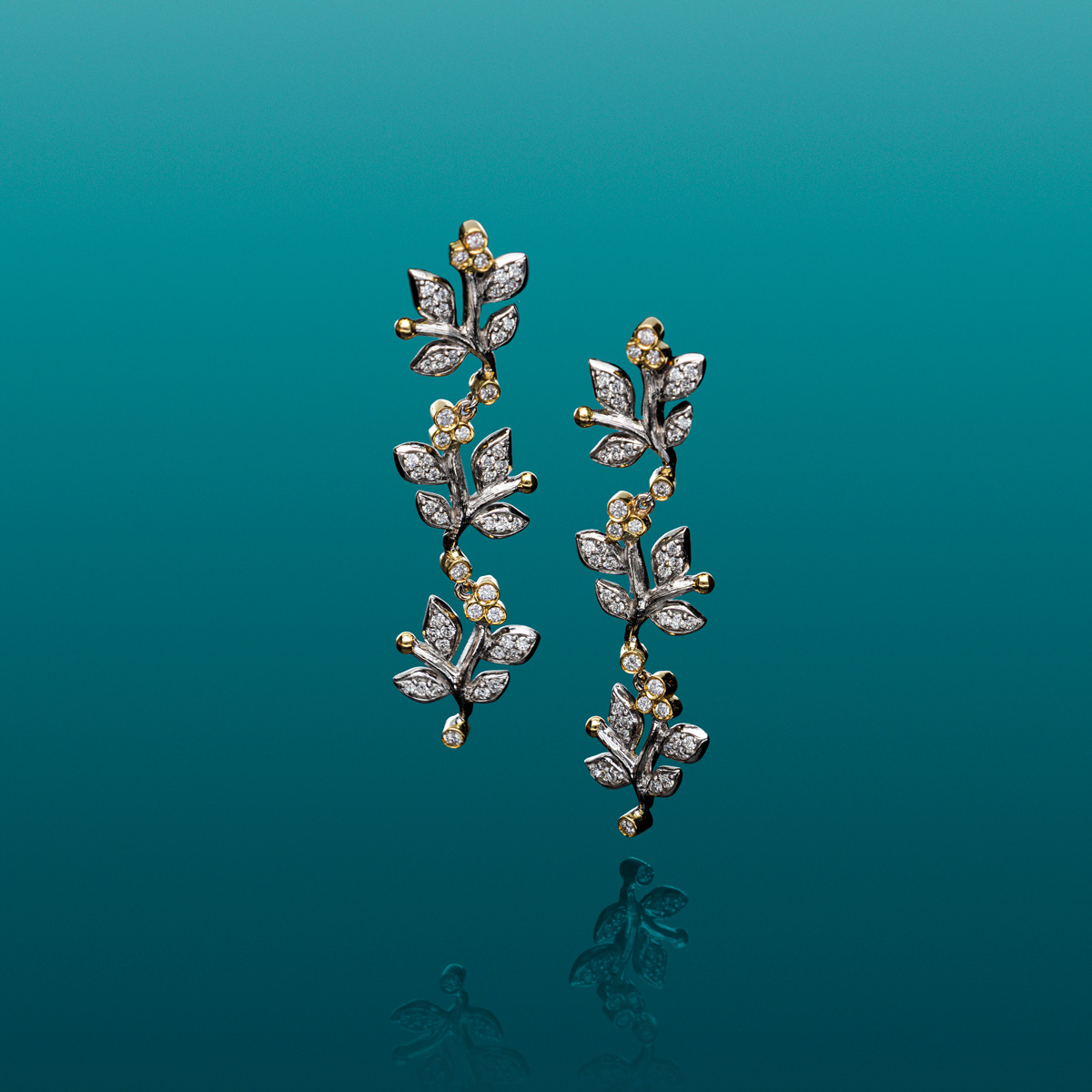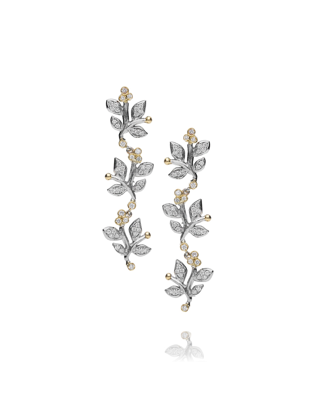 Orecchini realizzati a mano, esclusivamente nel laboratorio de' Nobili, in oro bianco e giallo 18kt con diamanti taglio brillante di qualità F-VVS .