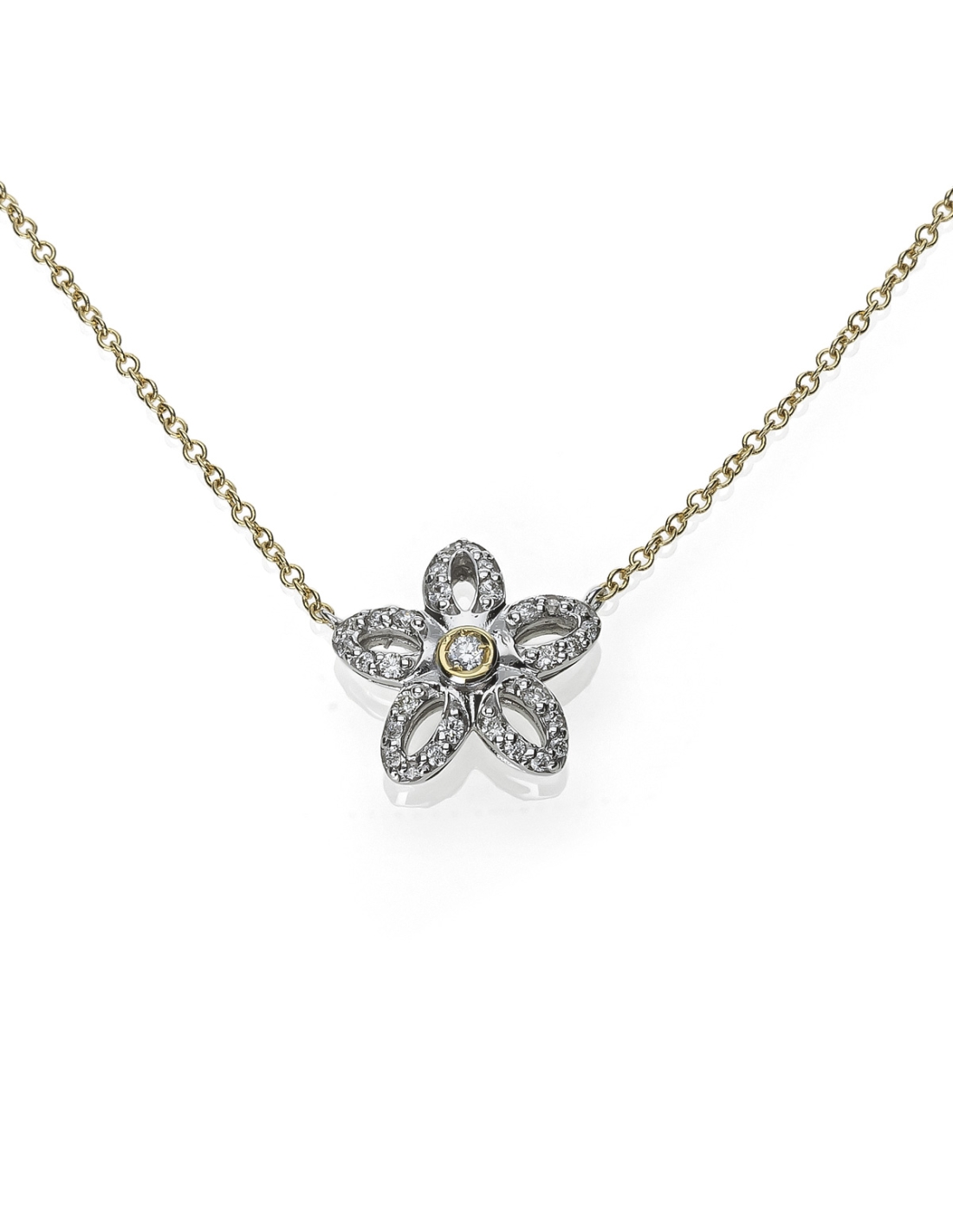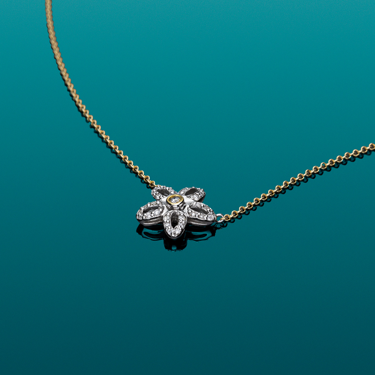 Collana realizzata a mano, esclusivamente nel laboratorio de' Nobili, in oro bianco e giallo 18kt con diamanti taglio brillante di qualità F-VVS .