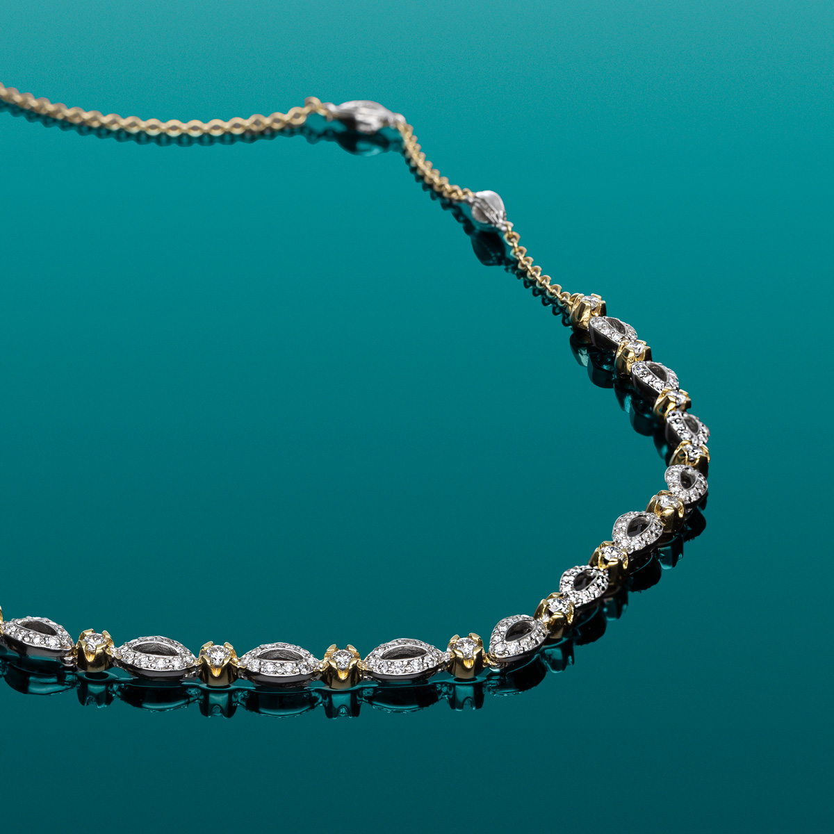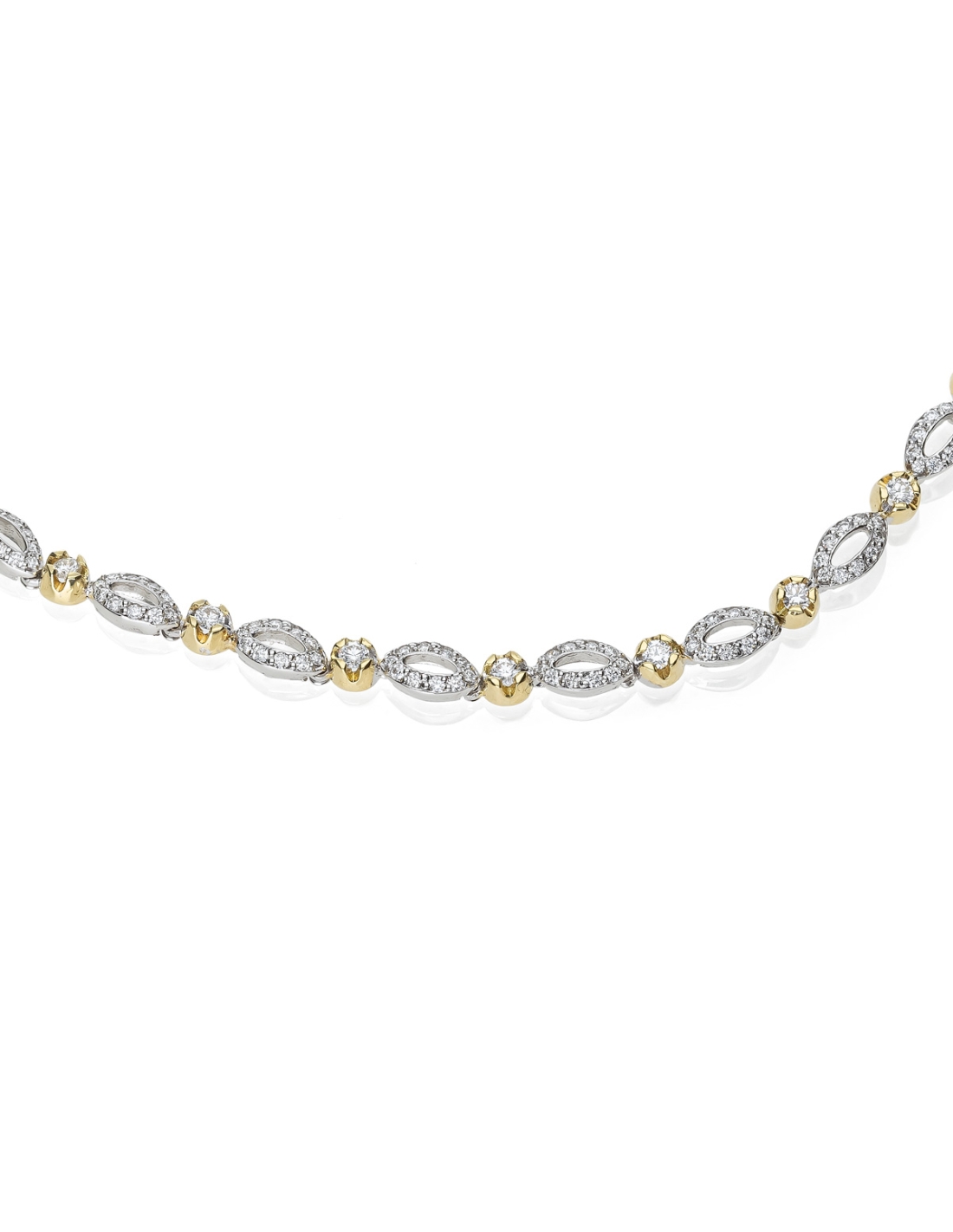 Collana realizzata a mano, esclusivamente nel laboratorio de' Nobili, in oro bianco e giallo 18kt con diamanti taglio brillante di qualità F-VVS .