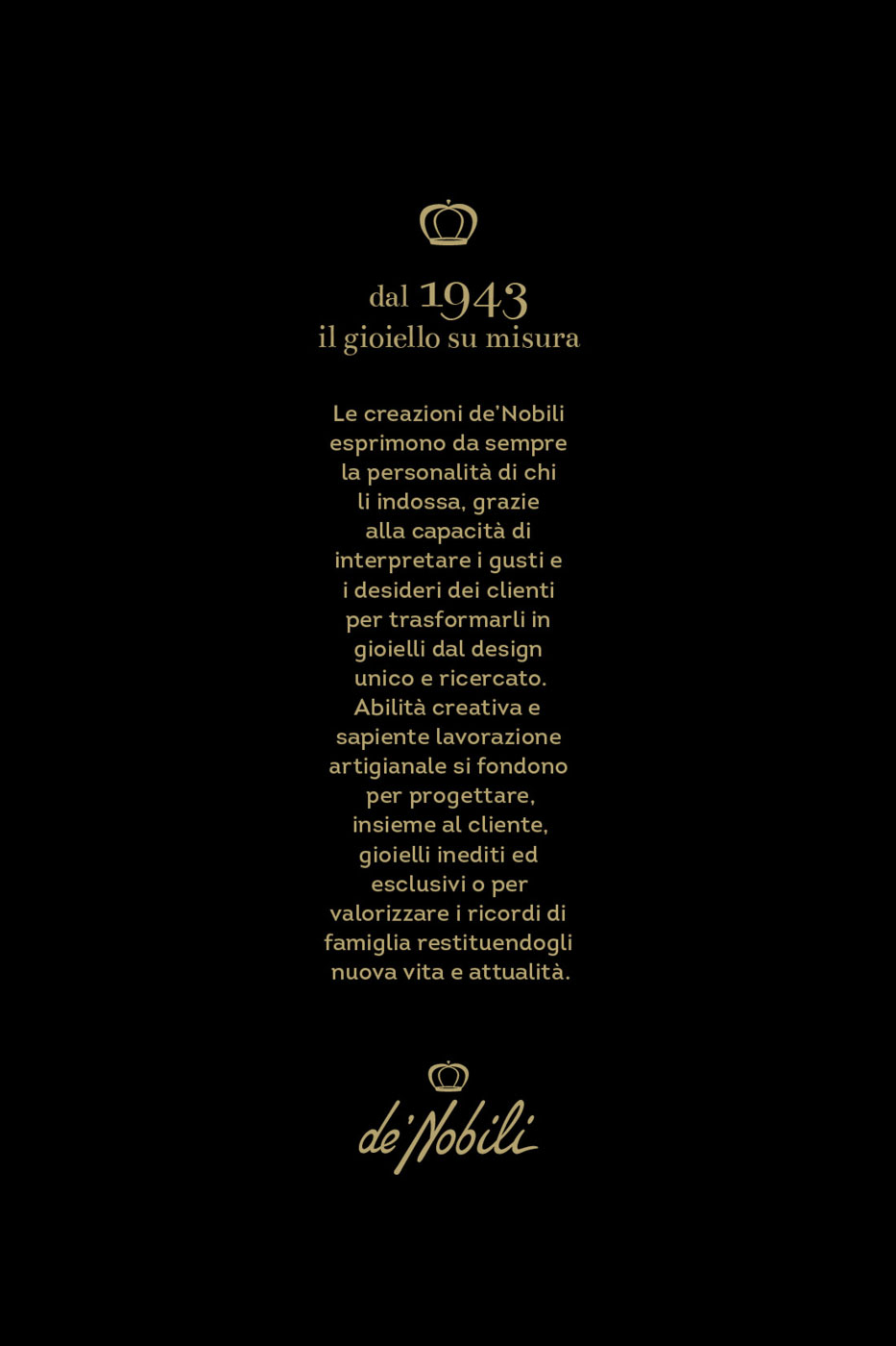 Le creazioni de’Nobili esprimono da sempre la personalità di chi li indossa, grazie alla capacità di interpretare i gusti e i desideri dei clienti per trasformarli in gioielli dal design unico e ricercato.