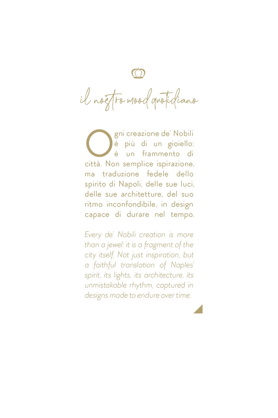 Ogni creazione de' Nobili è più di un gioiello: è un frammento di città. Non semplice ispirazione, ma traduzione fedele dello spirito di Napoli, delle sue luci, delle sue architetture, del suo ritmo inconfondibile, in design capace di durare nel tempo.