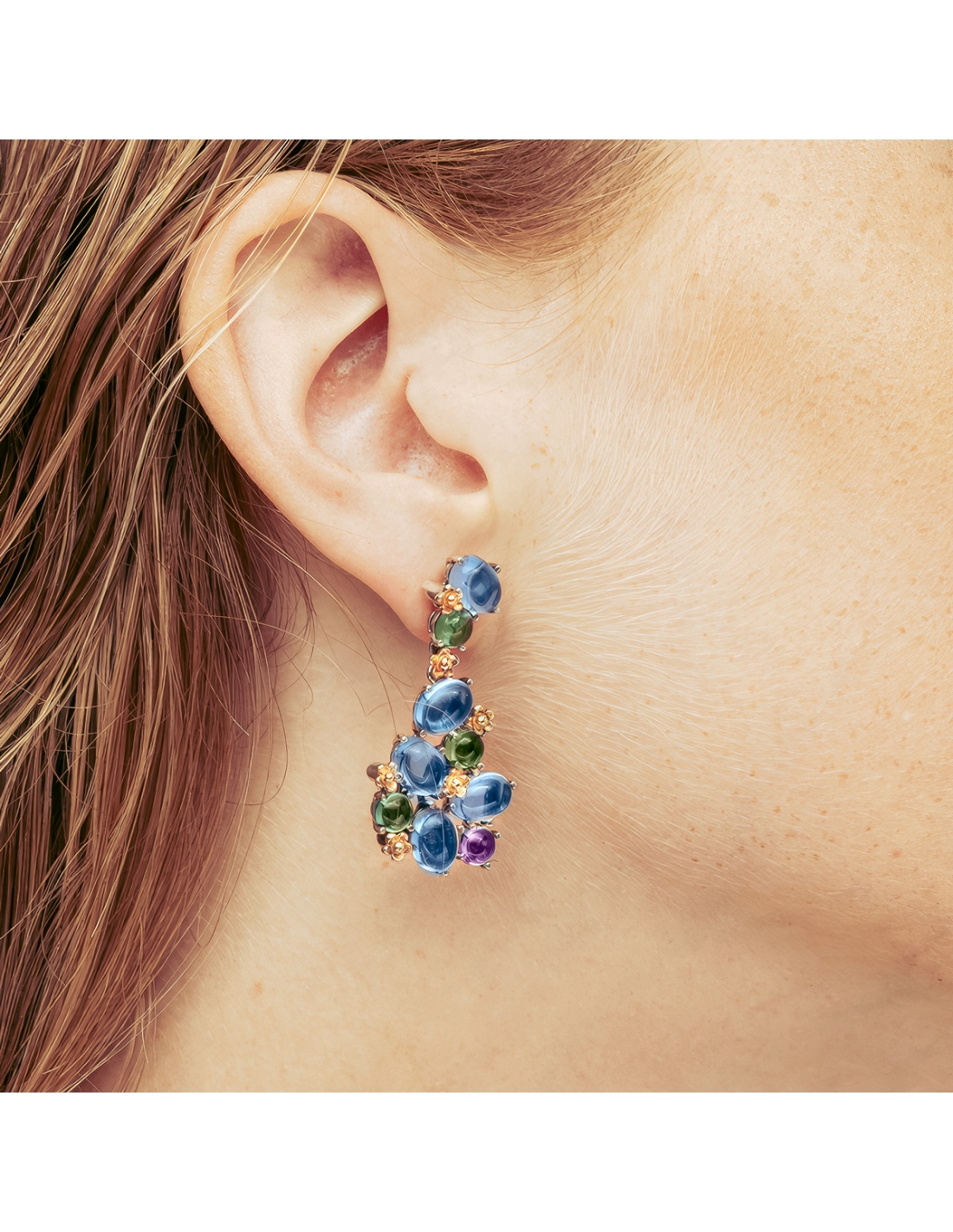 Orecchini realizzati a mano, esclusivamente nel laboratorio de' Nobili, in argento 925 e oro rosa 9kt con cabochon di quarzi idrotermali.