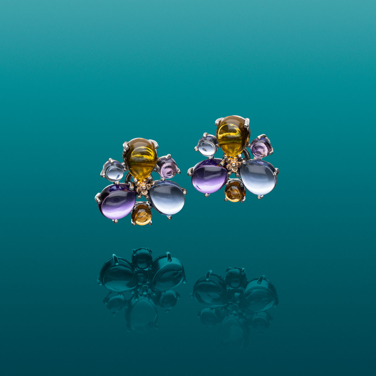 Orecchini realizzati a mano, esclusivamente nel laboratorio de' Nobili, in argento 925 e oro rosa 9kt con cabochon di quarzi idrotermali.