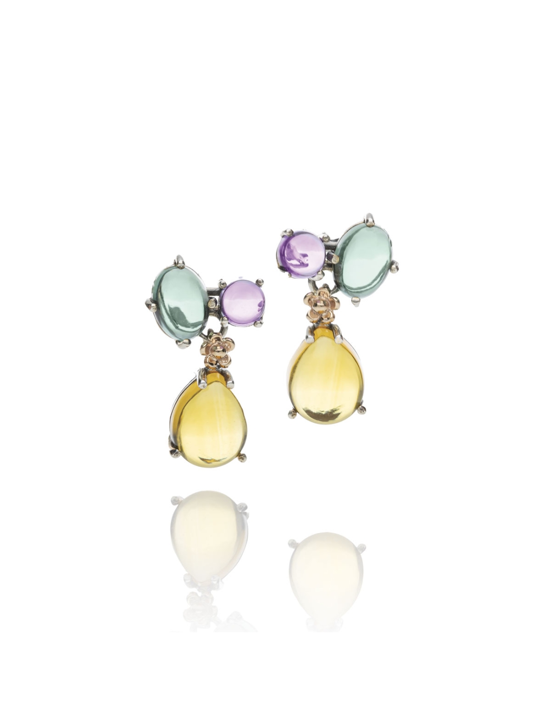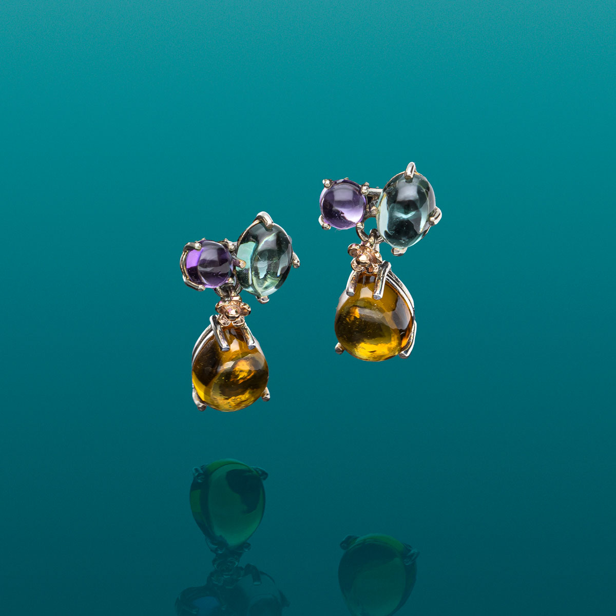 Orecchini realizzati a mano, esclusivamente nel laboratorio de' Nobili, in argento 925 e oro rosa 9kt con cabochon di quarzi idrotermali.
